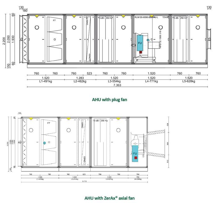 In optimale configuraties kan het rendement van de motor en de frequentieregelaar oplopen tot meer dan 95%, wat samen met het rendement van de ZerAx®-ventilator van 92% het totale systeemrendement tot een indrukwekkende 85% brengt. Dit is 20-25 procentpunten beter dan alternatieve oplossingen, zoals direct aangedreven centrifugaalventilatoren met EC-motoren. Het is momenteel het hoogst mogelijke totale systeemrendement voor LBK's op de markt. Door het hoge rendement van de ZerAx® is het mogelijk om tot 30% kortere en 30% lichtere LBK's te ontwerpen die nog steeds dezelfde prestatiekenmerken hebben en dus minder kosten met zich meebrengen. De ZerAx®-ventilatoren voor LBK's zijn complete plug & play oplossingen om een eenvoudige en snelle installatie te garanderen. Het geluidsniveau van de ventilatoren is aanzienlijk lager dan dat van andere ventilatorfabrikanten. De levensduur van de ventilatoren is meer dan 20 jaar, wat bijdraagt aan de duurzaamheid en lage onderhoudskosten garandeert.